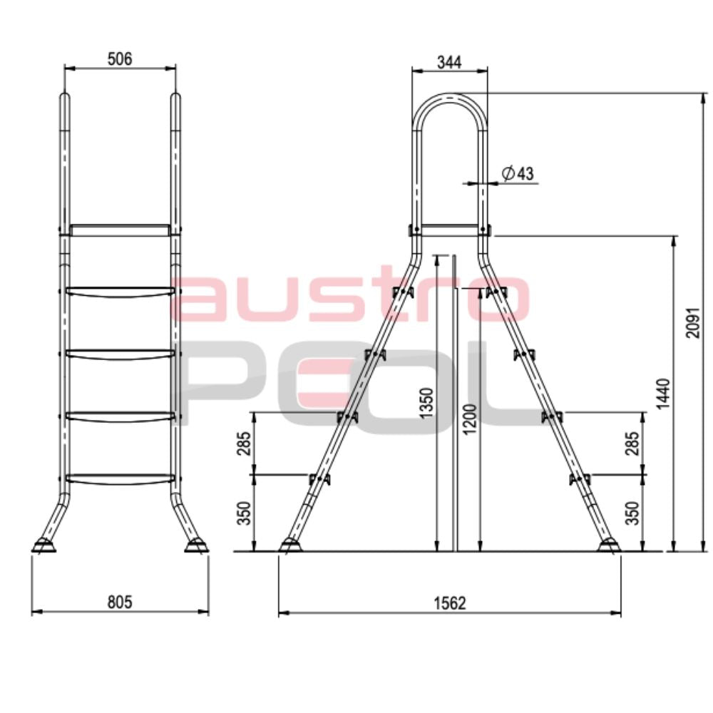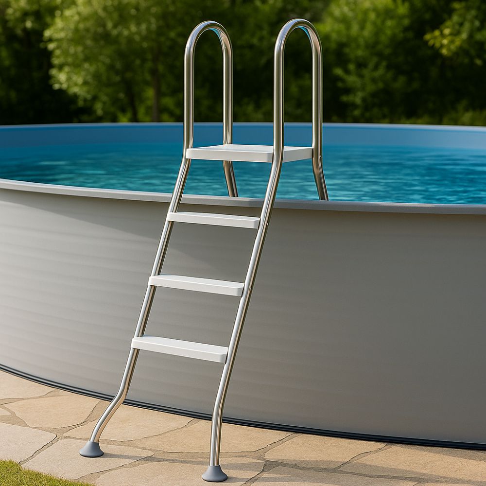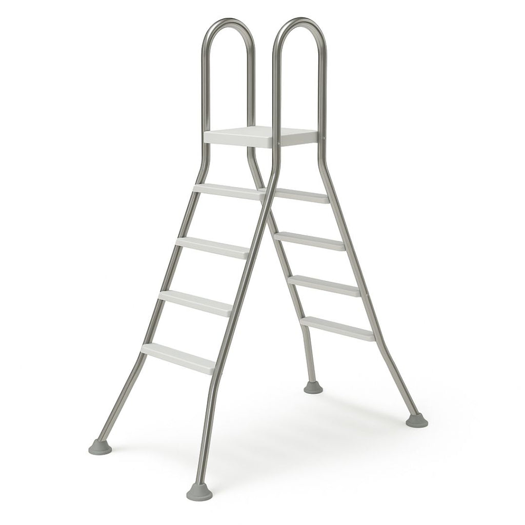 Die stabile Pool-Leiter besticht durch robuste Leiterholme aus hochglanzpoliertem V2A-Edelstahl (Ø 43 mm). Sie ist beidseitig mit jeweils vier rutschhemmenden Kunststoffstufen sowie einer mittigen Plattform ausgestattet und eignet sich ideal für Aufstellpools mit einer Höhe von 1,20 m oder 1,35 m.